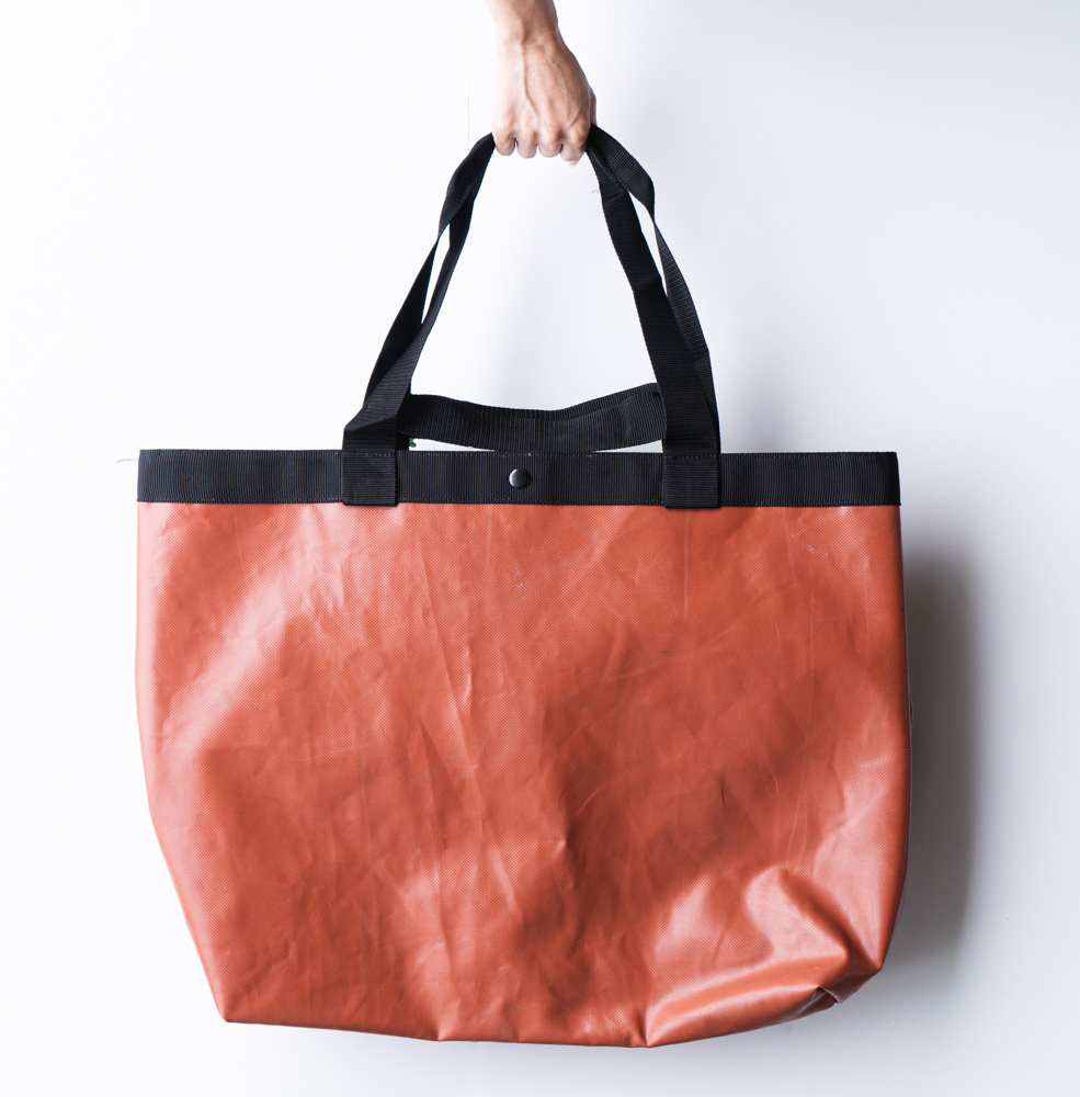 本製品で使用されている素材“ フレキシブルコンテナ(フレコン) ” とは粉体や粒状のものを保管・輸送するための産業用の大型搬送用パッケージです。フレコンは、約1,000kgの荷重に耐える強度を持ち、リターナブルに何度もリユースされ、15年ほど利用された後に廃棄されているのですが、15年後でも強度が80-90%ほど残っているので、素材から見立てを変えるとまだまだ活躍できる可能性を秘めています。今回、このロングライフ性を活かし、より長く使えるアップサイクル製品へと再生(RePLAY)しました。