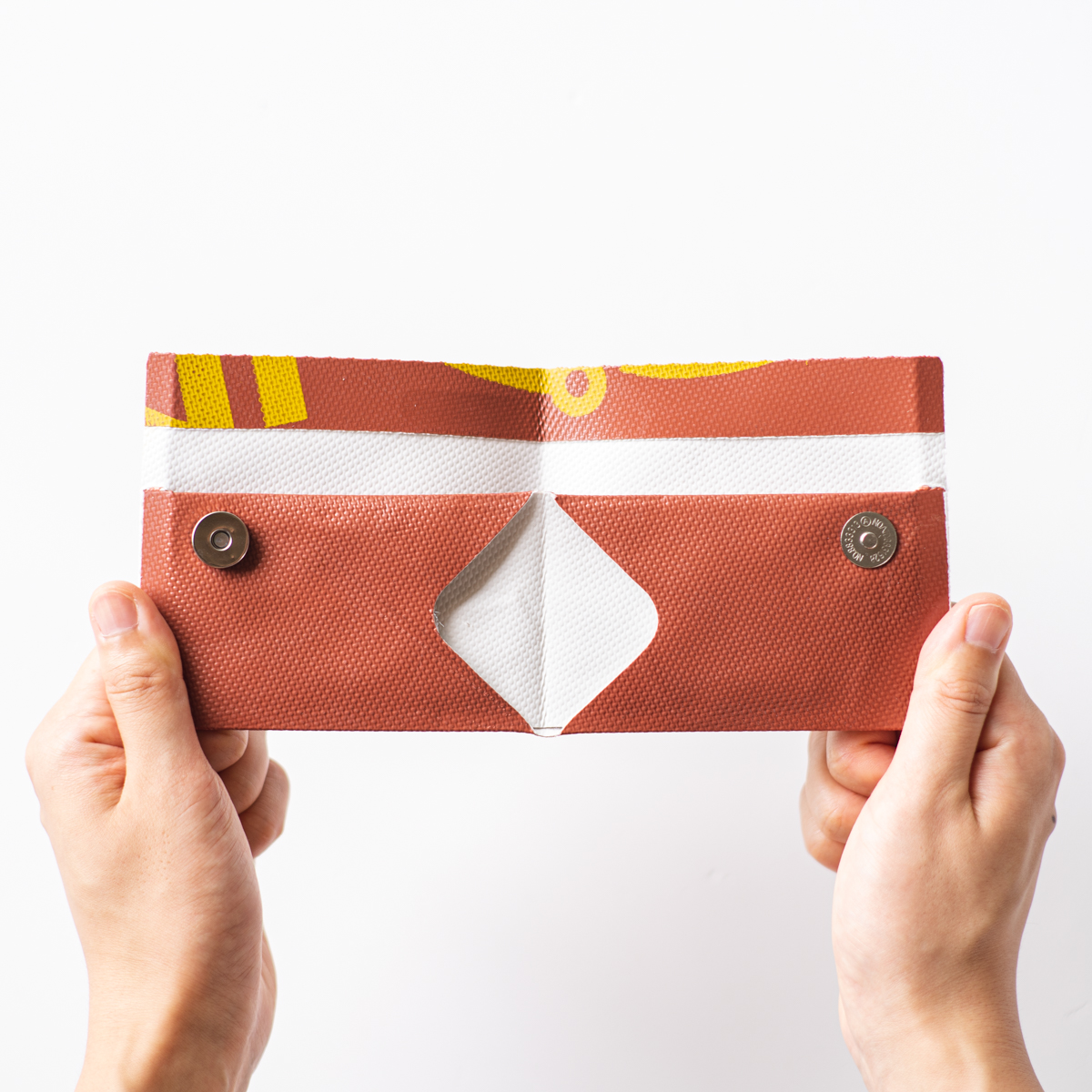 こちらは、プラスチック原料などを保管・配送する際に使用しているリターナブルフレキシブルコンテナから作ったアップサイクルウォレットです。
