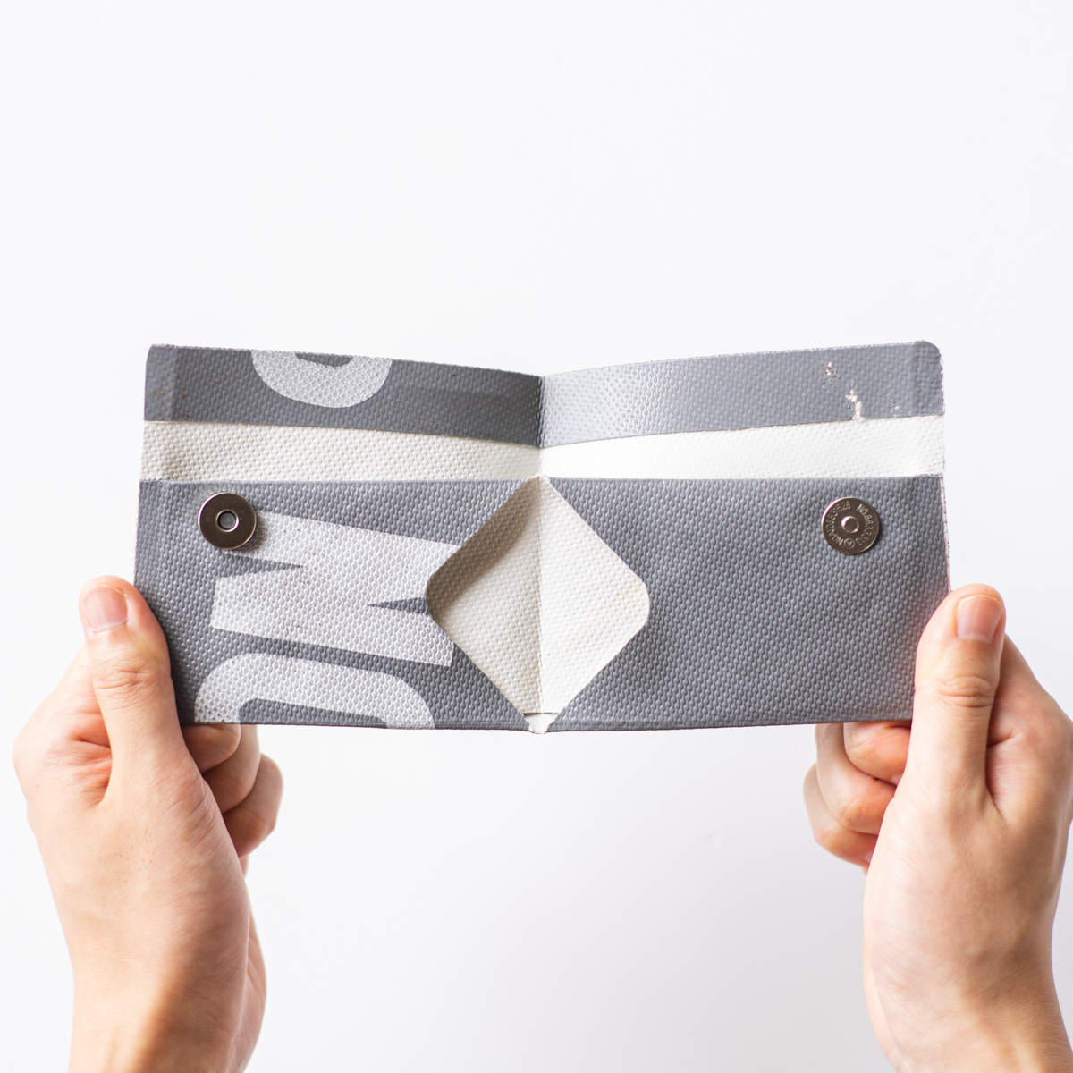 こちらは、プラスチック原料などを保管・配送する際に使用しているリターナブルフレキシブルコンテナから作ったアップサイクルウォレットです。