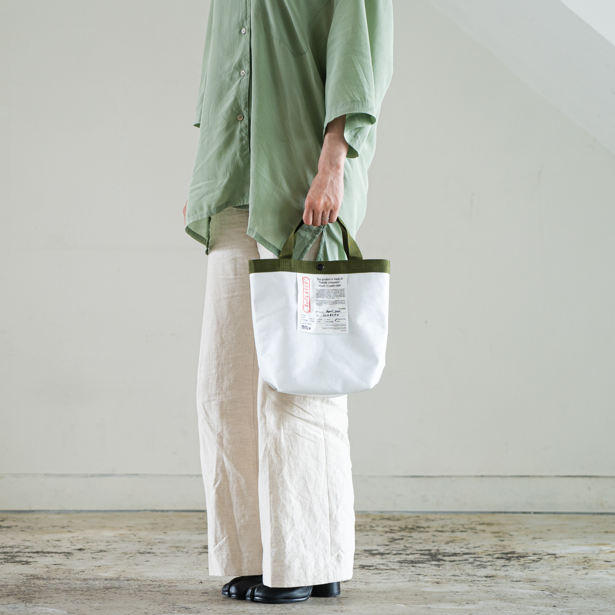 本製品で使用されている素材“ フレキシブルコンテナ(フレコン) ” とは粉体や粒状のものを保管・輸送するための産業用の大型搬送用パッケージです。このフレコン素材は、約1,000kgの荷物を運ぶのに十分耐える強度を持ち、リターナブルに何度もリユースされ15年ほど利用された後に廃棄されるのですが、15年後でも残存強度が70-90%ほど残っているので、素材から見立てを変えるとまだまだ第2の人生を活躍できる可能性を秘めています。今回、この素材のロングライフ性を活かし、更に長く使っていただけるようアップサイクル製品へと再生(RePLAY)しました。
